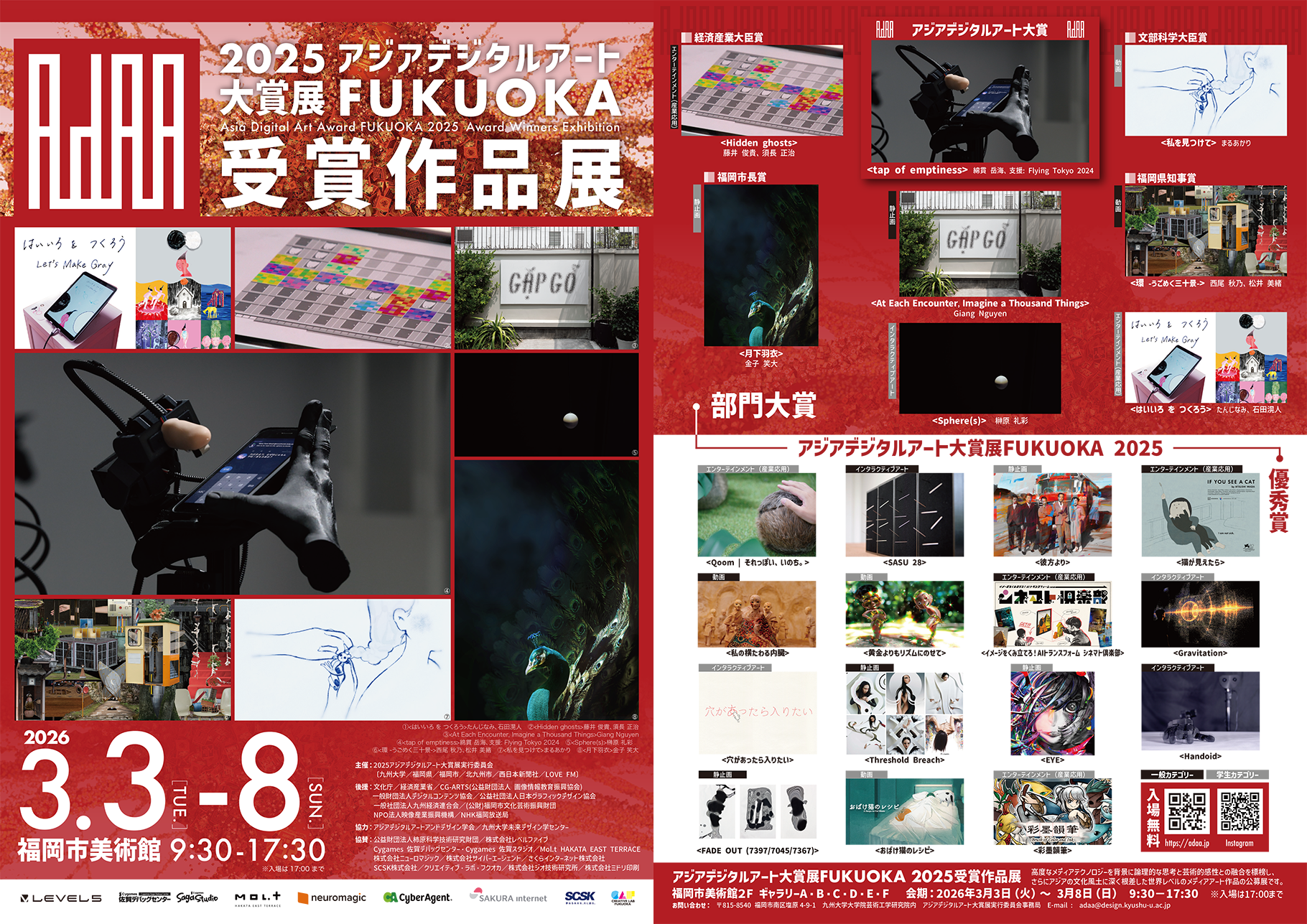 Join us for the Award-Winners' Exhibition "2025 Asia Digital Art Awards Exhibition FUKUOKA," taking place at Fukuoka Art Museum from Tuesday, March 3, to Sunday, March 8, 2026.